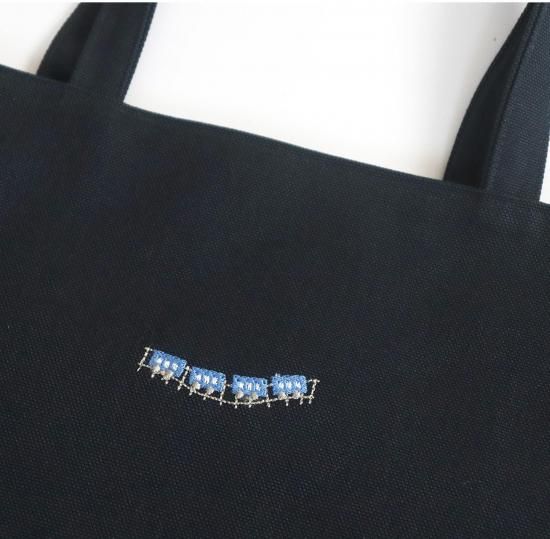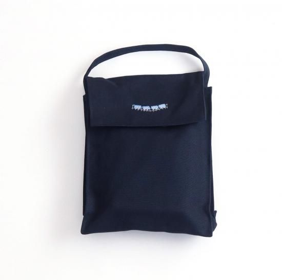 人気の電車刺繍シリーズ。大人サイズのスリッパもらくらく入ります。丈夫な帆布で作りました。裏地はナイロンなのでよごれたときも、さっと布で拭き取れます。