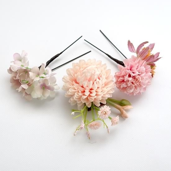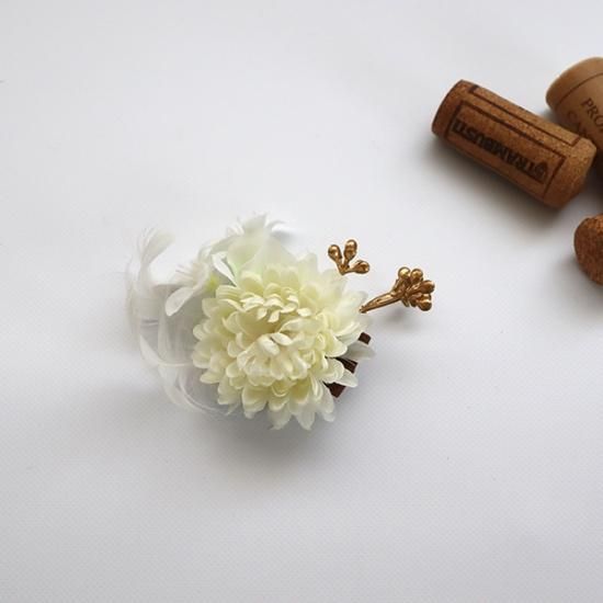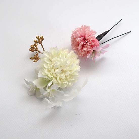 コロンとしたマム(ホワイト)とフェザー(ホワイト)がとても華やかな髪かざりです。
